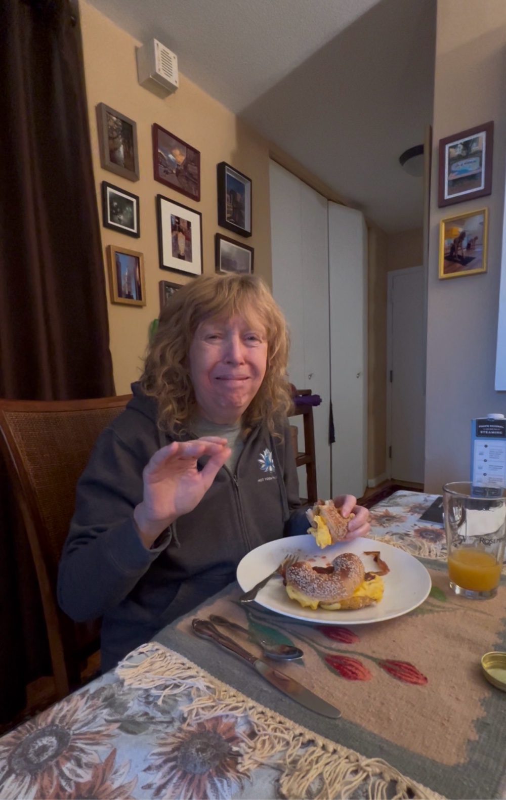 bagel so she got a special and I got it egg white they didn’t have any egg whites so regular old eggs. I don’t know what that means but I went with it. So I’m sitting here next to a bunch of young people talking