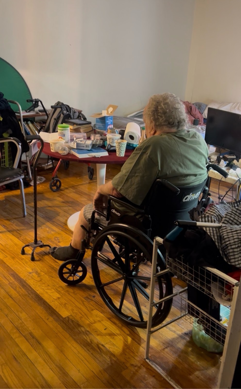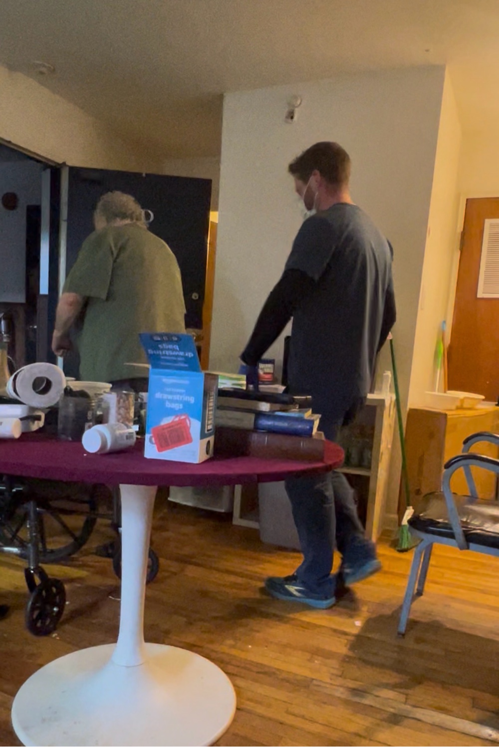 then left with Mary and went to the convenient store. She picked up a sandwich and I got a couple bananas tea for breakfast once I got the Mike’s a new issue came up where he broke the monitor to his