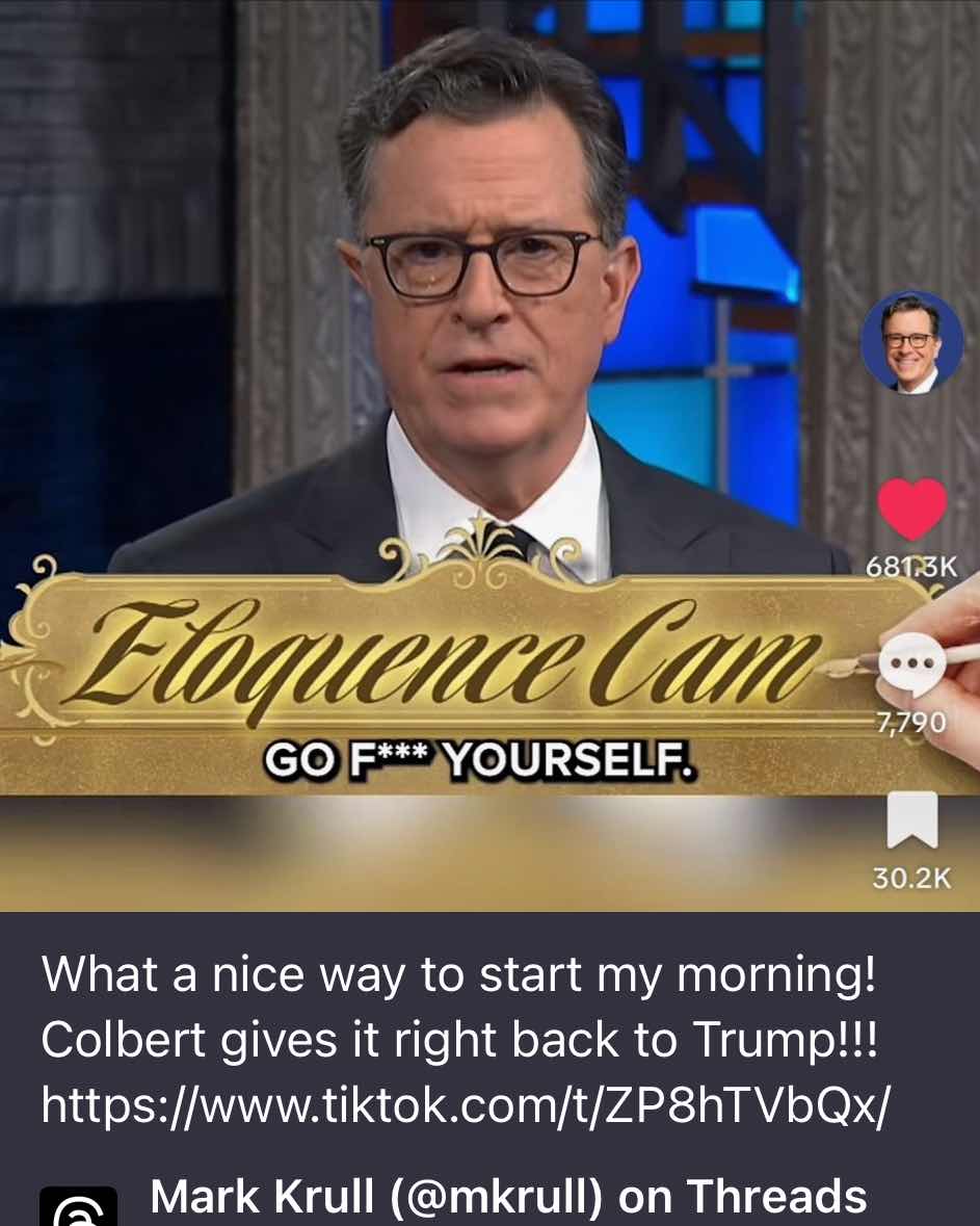 good Stephen Colbert really gave it to Trump on the show last night and I just saw it this morning. He got told Trump to go fuck himself! I’ve then did some stuff around the