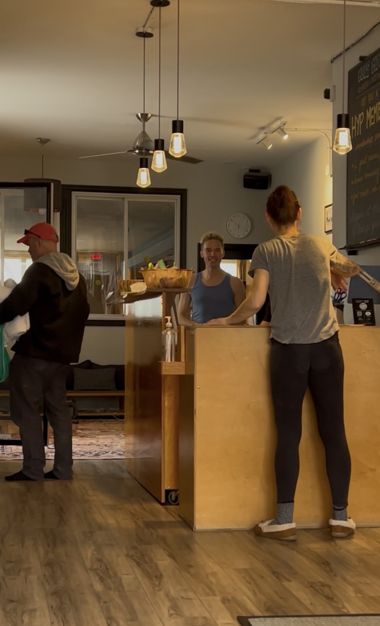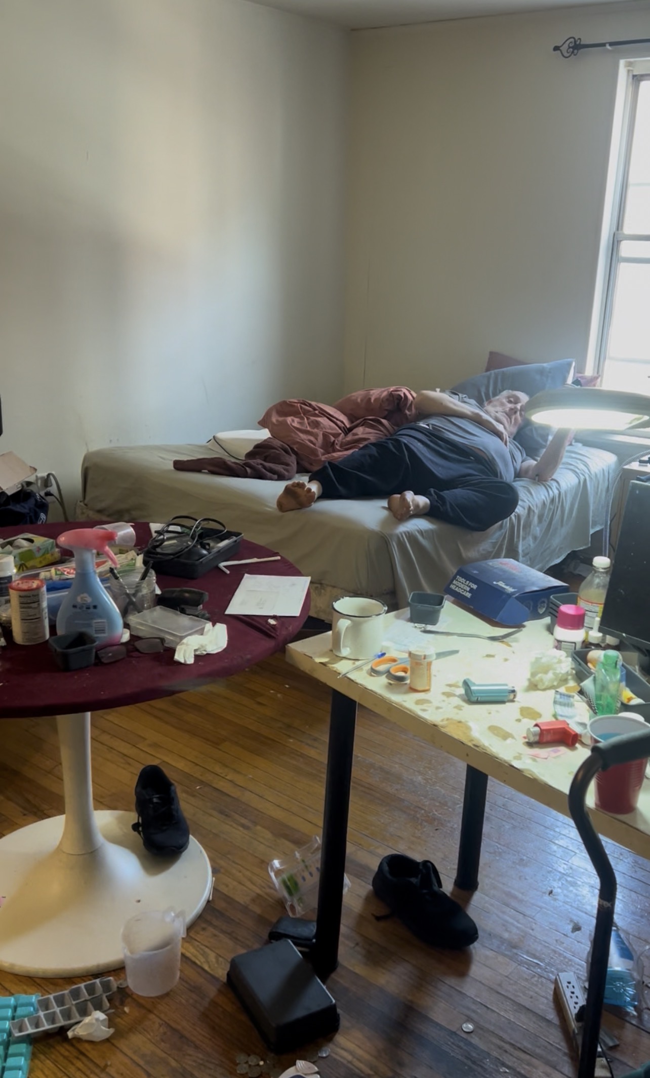Mike might be done soon. They had him in this little room for a while. This office is full of boxes and stuff. In the front it’s pretty funny. Mike