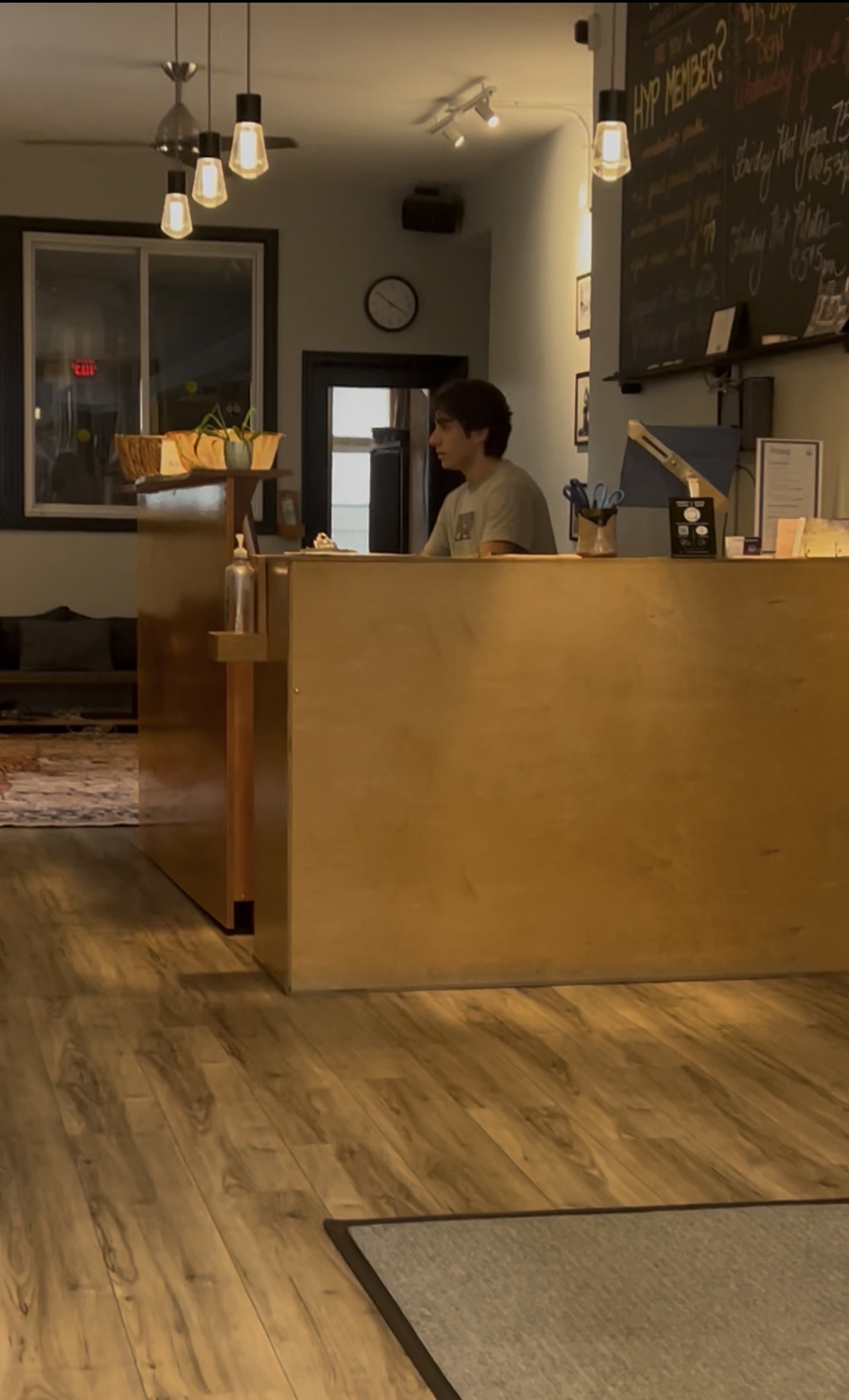 meet Larry up there at the studio. It’s 3:23 PM. Well, we arrived at the yoga studio in Larry was already there. He signed in and as a guest and got ready to go, and we saved the spot for him right near the door just in case. I figured