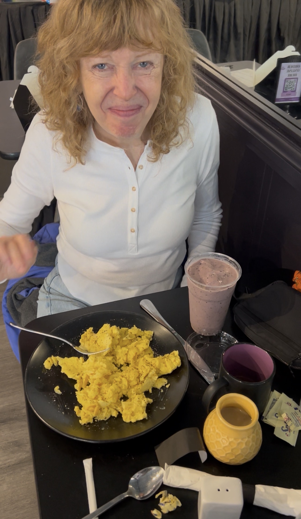 Good day everyone today is Saturday. After a decent night of sleep, we got up at breakfast at the café and I had eggs and one of their smoothies,